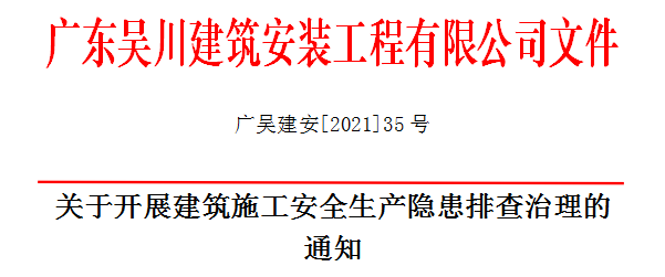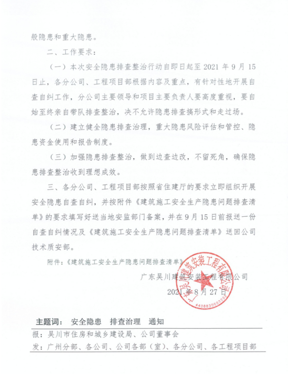 一、根據(jù)省、市住建主管部門關(guān)于全面開(kāi)展建筑施工安全生產(chǎn)隱患排查治理的通知要求,公司董事會(huì)要求各分公司、工程項(xiàng)目部從即日起對(duì)在建工地開(kāi)展建筑施工安全生產(chǎn)隱患排查治理行動(dòng)。